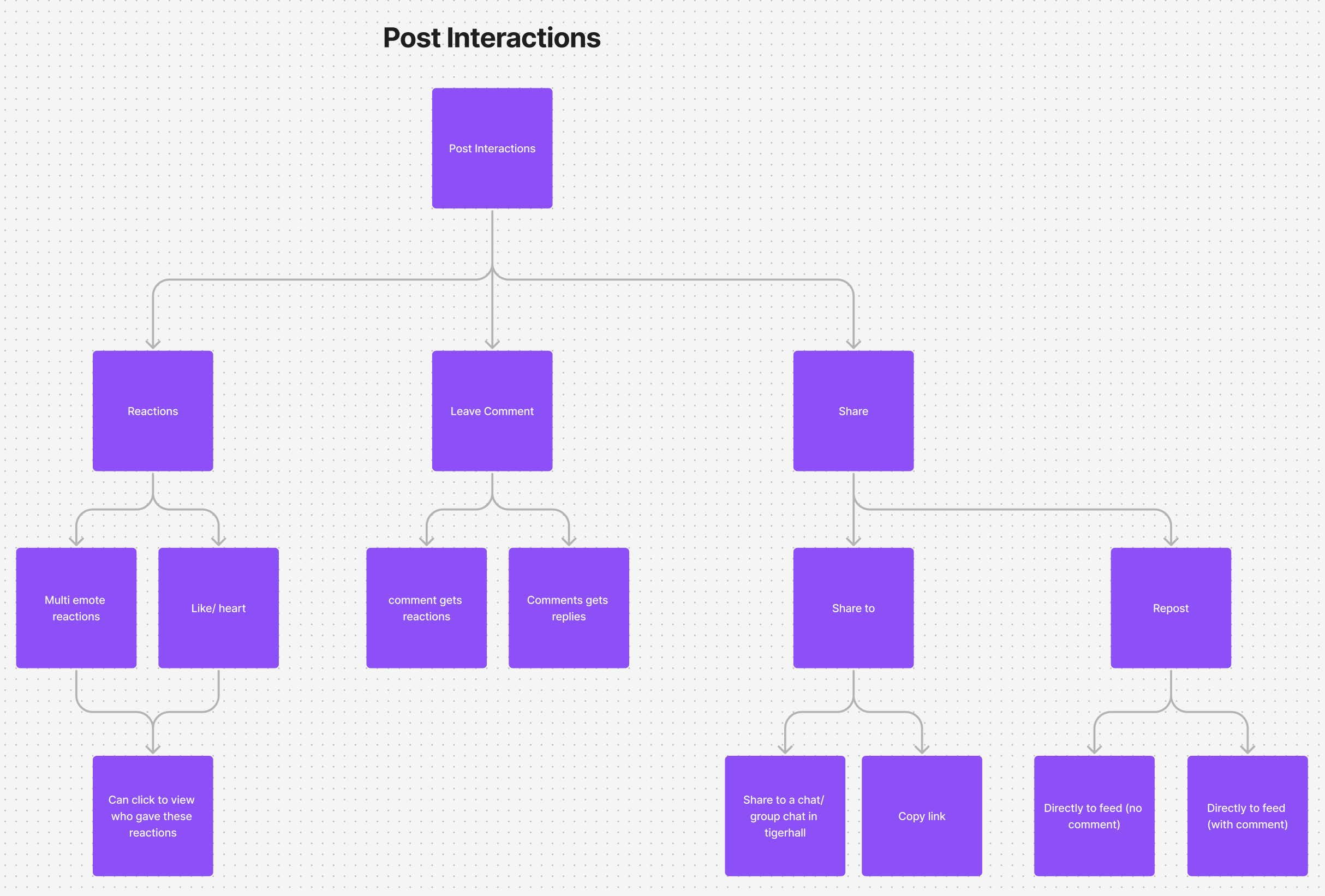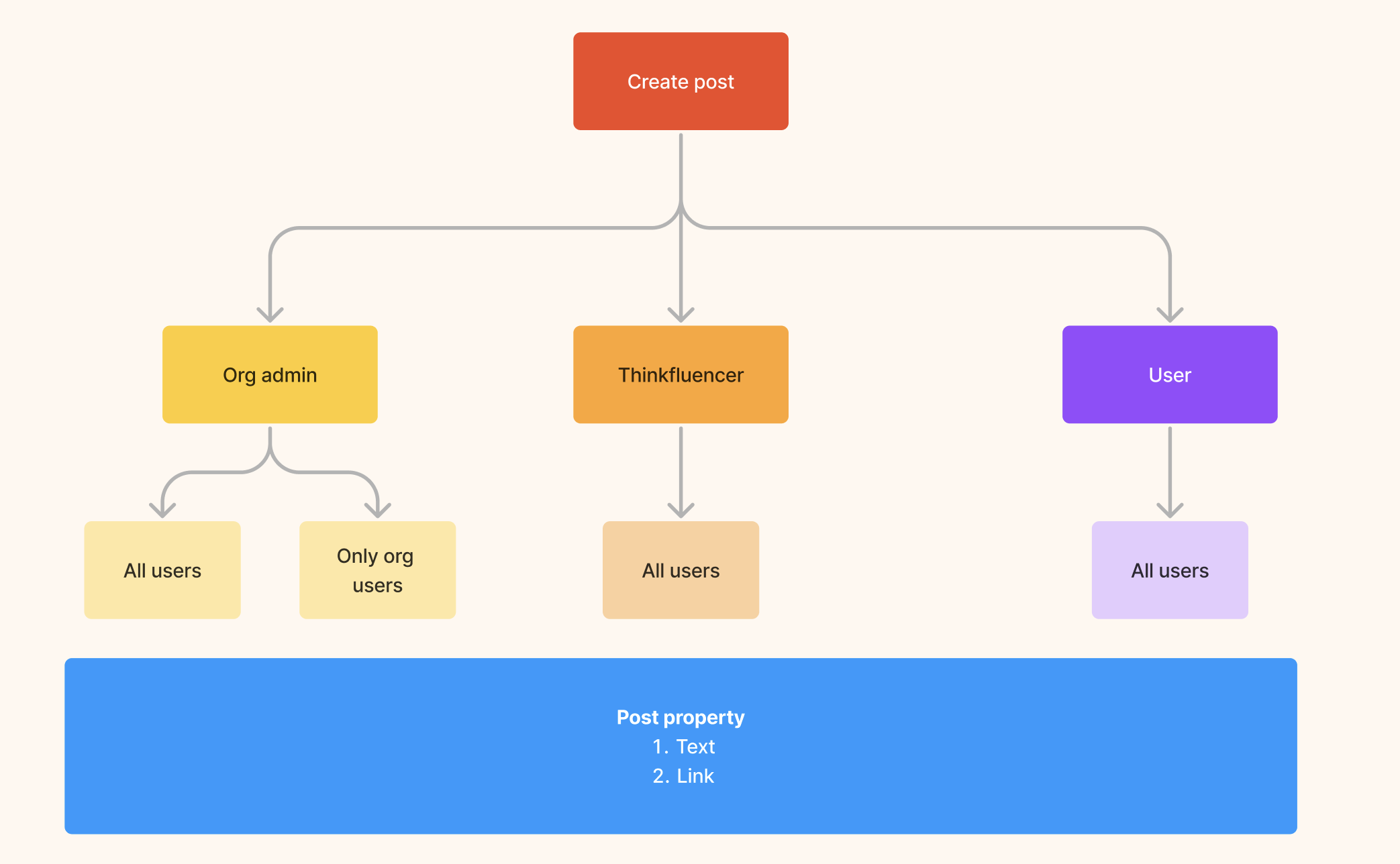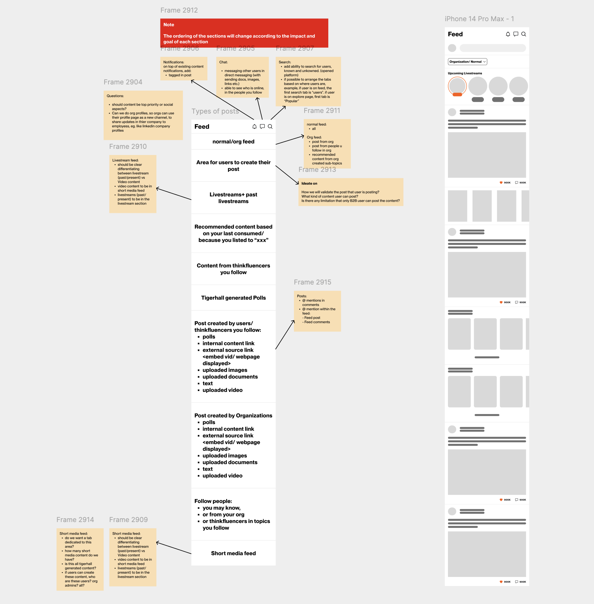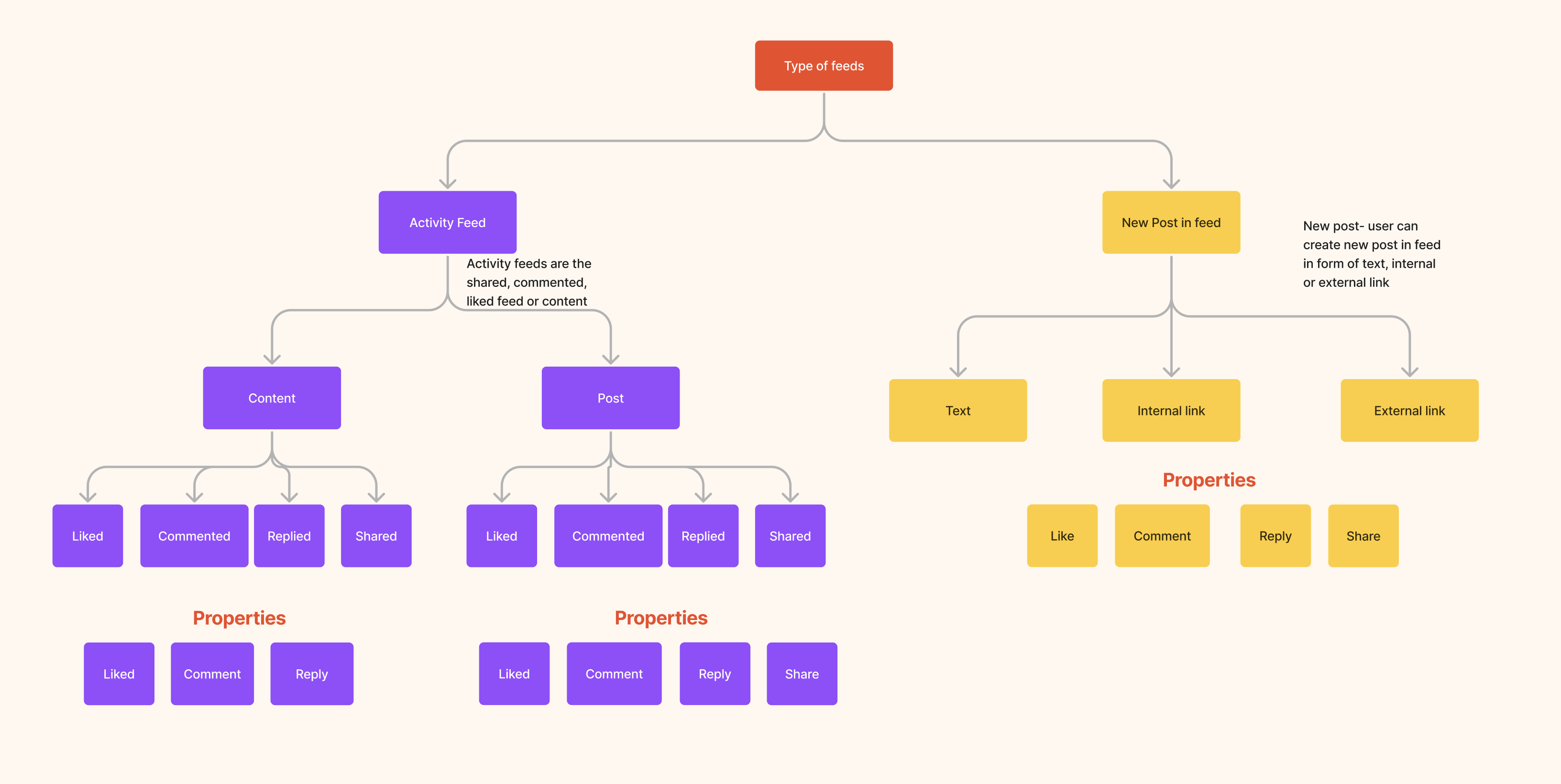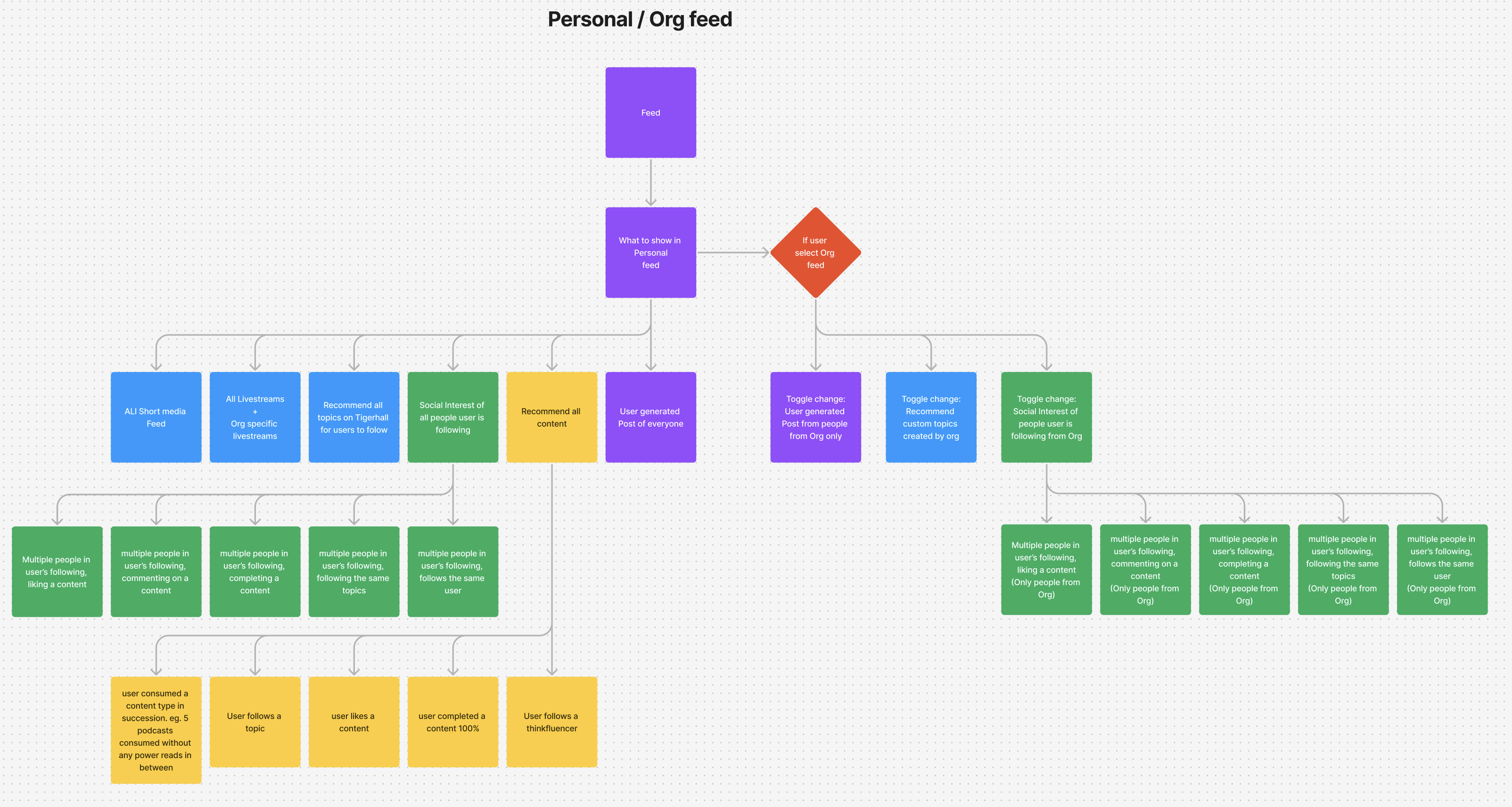 Through collaborative discussions, we began developing flowcharts for various aspects of the experience. Including Feed Types, Post Creation, Recommendations, Post Types, Interactions, and considerations for Personal vs. Organisational Feeds.