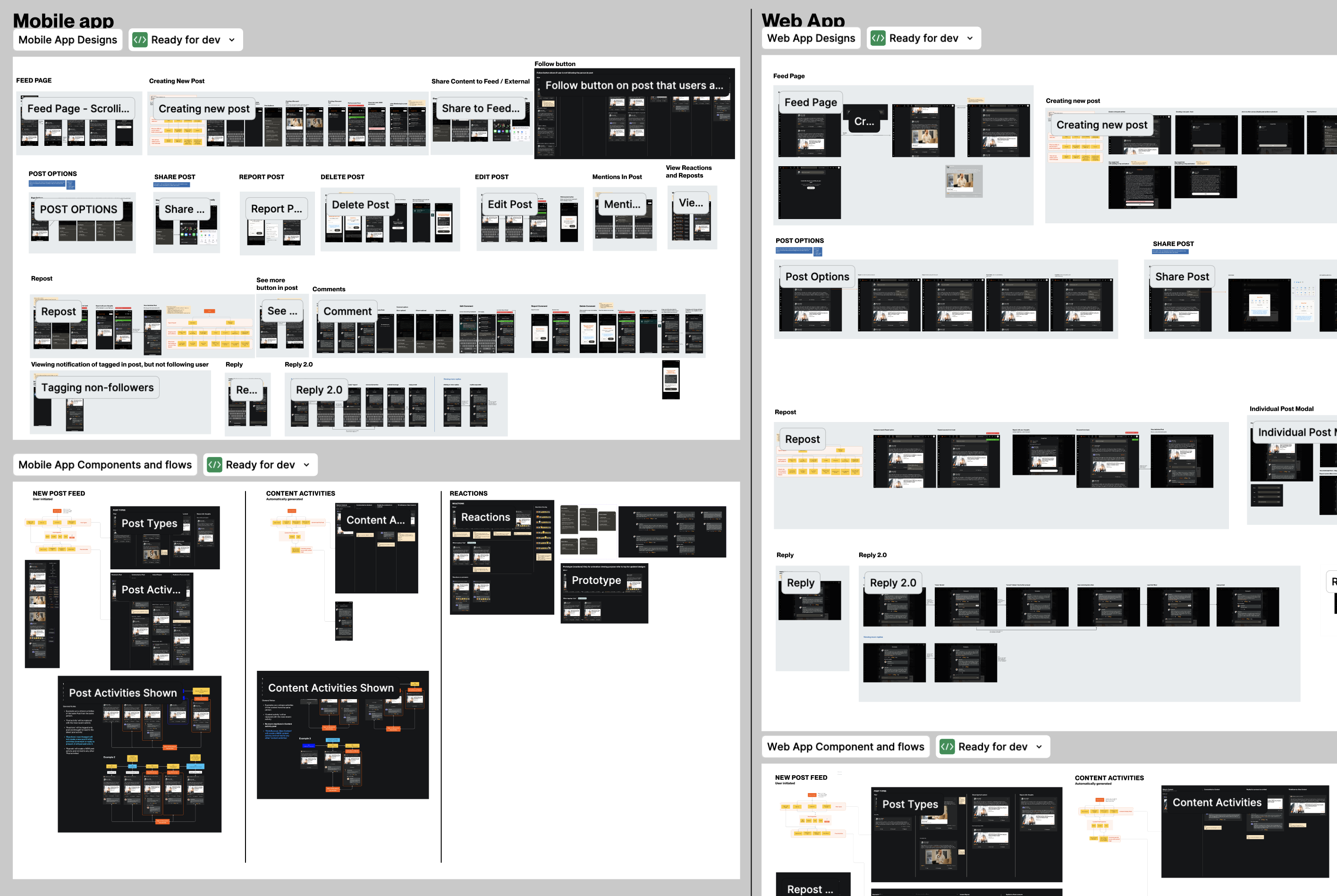 As I developed the designs, I organized them into distinct sections such as “Feed Page,” “Creating a New Post,” and “Post Options” to ensure clarity and structure.