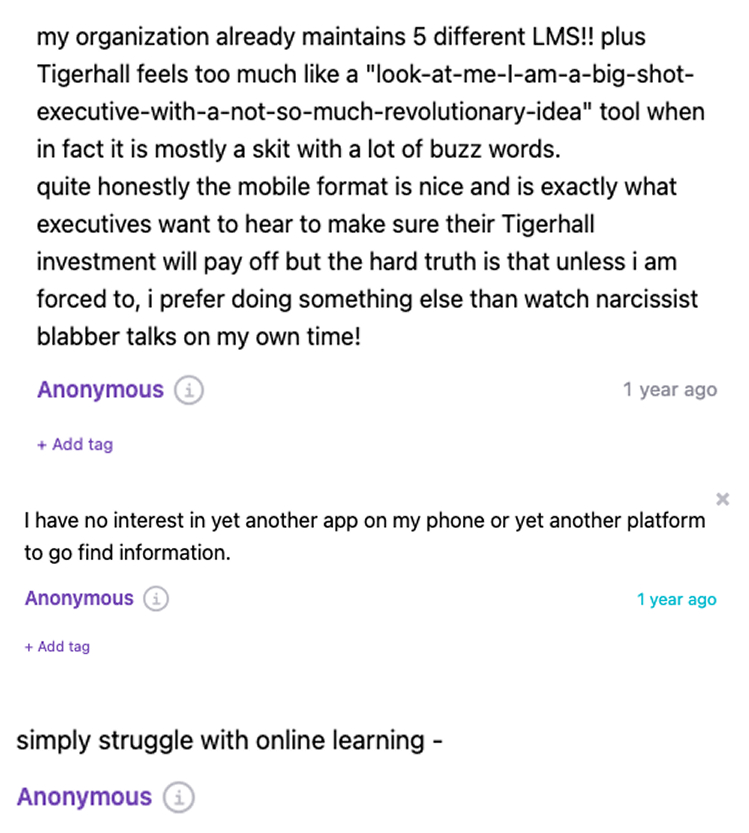 Some common issues voiced by users are the amount of LMS tools they have in the organisation, and that it is just another information platform. Also, some struggle with with online learning.